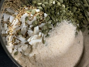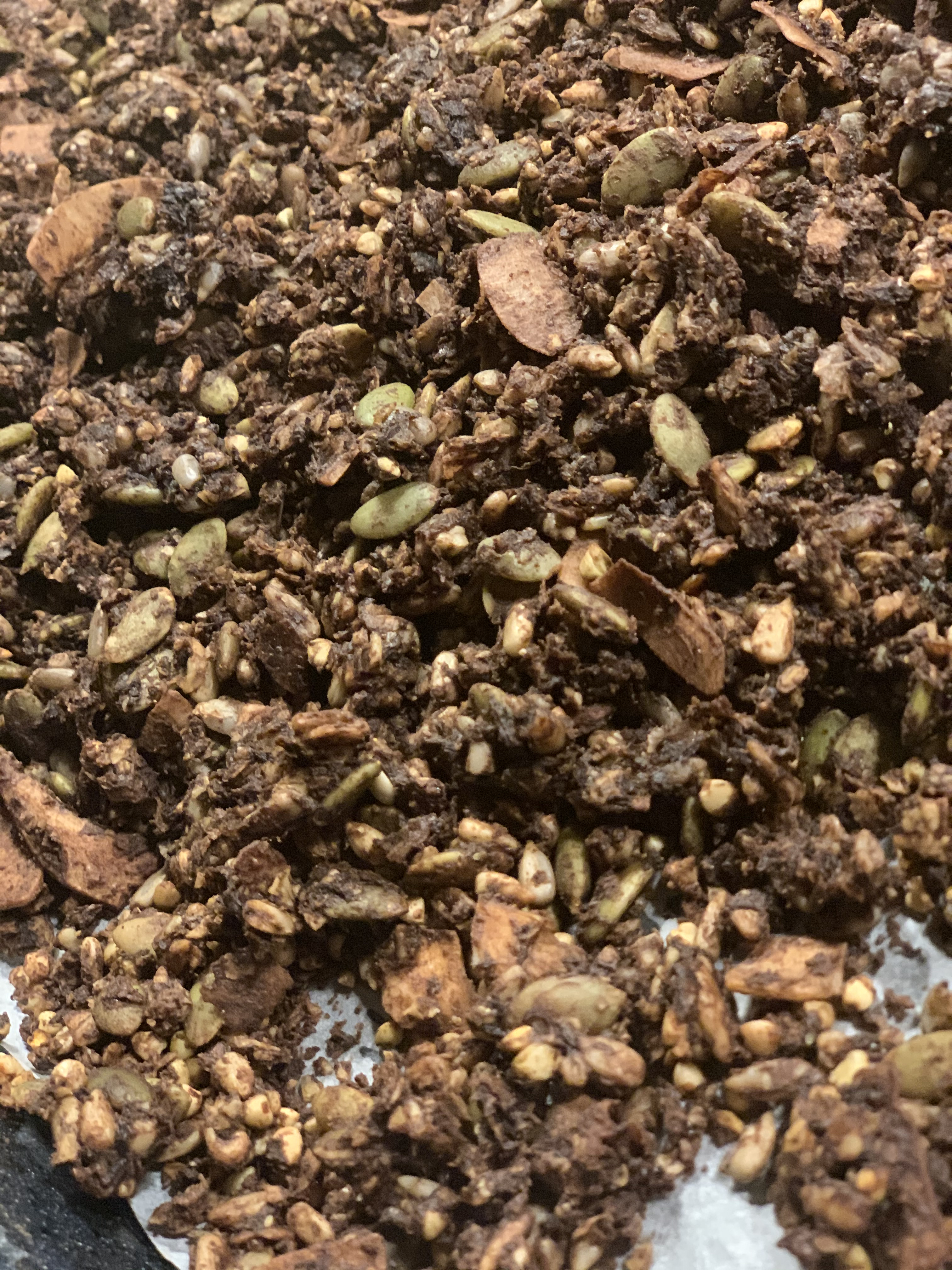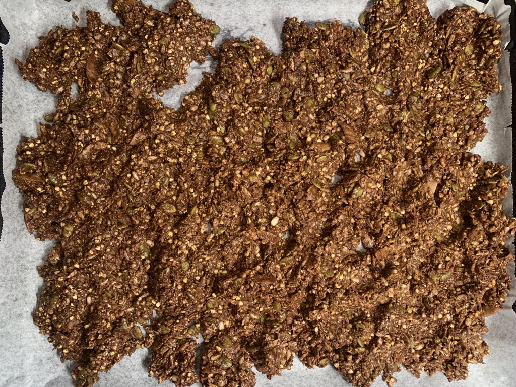 För att äta gott och samtidigt intet trycka i mig bröd, landar jag i olika saker i perioder. Det kan vara havregrynsgröt med äpple och kanel, ägg, knäckebröd eller kvarg, som leder till det här inlägget. Jag smakat mig igenom väldigt många olika smaker och ett antal märken på kvargen och min absoluta favorit är Arlas vaniljkvarg. För att äta kvarg, eller yoghurt för den delen så behöver jag något att bita i. Länge handlat granola av olika slag och müsli. Personligen föredrar jag när de inte är för söta eller består till största del av havregryn/ corn flakes eller puffat ris. Jag vill ha olika frön och en smakrik granola i min kvarg. Testat mig fram med olika proportioner av kakao och ingredienser och landat i att detta är en väldigt god granola med chokladsmak. Hoppas att ni bågar testa den och uppskattar den lika mycket som jag och min familj gör.