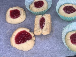 Får börja med att erkänna att detta var snäppet svårare än vad jag trodde när jag rörde ihop min första batch på lunchrasten idag. De kändes så bra och de såg så fina ut men kom ut ur ugnen som sexkantiga, plattor med lite sylt i mitten. Spröda så man knappt kunde lyfta dem. Jag gjorde en snabb modifiering av recept för batch 2, ökade mjöl och xantangummi, minskade på bakpulvret och bakade dem i muffinsformar. Men de var fortfarande alldeles för spröda när de hade börjat svalna.
