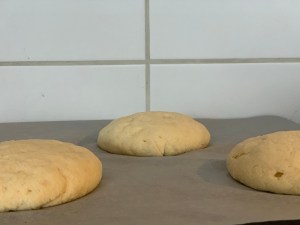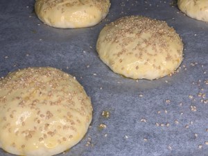 Precis som med kardemummabullarna har jag testat två vägar efter första jäsningen. Den ena var att väga upp bitarna, rulla bollarna och jäsa dem andra gången innan bak. Det andra var att sätta andra halvan deg i kylen i 2h, sen rullade jag bollarna och jäste i 90min. Smak och konsistens blev inte direkt annorlunda men degen blev mer hanterbar efter kylen. Men om man mjölar händerna medans man rullar bollarna så får man ihop dem utan att degen fastnar i hela handen och då behöver man inte vänta den tiden. Om man vill dela upp sitt bak så kan man jäsa första delen på morgonen eller kvällen före man ska baka av dem, sen kyla degen och ta fram och rulla bullarna efter lunch eller på morgonen, sen jäsa och baka. Då kan man ha nybakade bröd till sin burgarmiddag eller lunch.