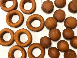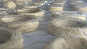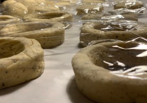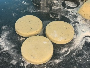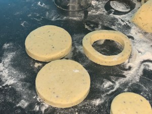 - Kavla till 1,5-2cm tjock platta och stansa ut önskad storlek/form, alternativt rulla bollar. Jag stansade med en ring som är 8,5cm och ur den stansade jag en platta som är 5,5cm. Det blev min ring och min klassiska runda och platta. För bollarna så vägde jag upp 40-45g deg och rullade till en slät boll i handen. Sen när jag flyttade bollen till bakplåtspappret för jäsning så släppte jag den från ca 10cm höjd, för att botten skulle bli lite platt, så att den får en lite bättre yta att stå på sen.