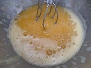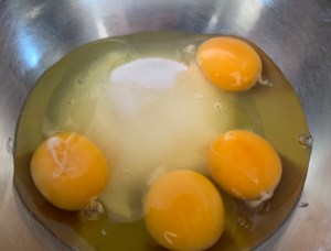 4. Värm ägg och socker till 37°c över vattenbad, och vispa det sedan vitt och pösigt