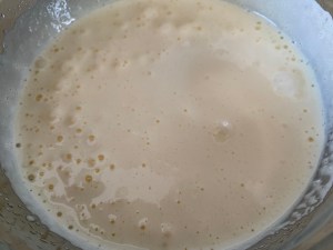 5. Sikta ner lite mjölmixen, lite i taget och vänd ner det med en slickepott, tills allt är blandat och smeten är slät