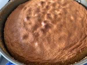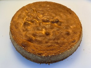 7. Ta ut ur ugnen när den är klar, lägg en bakplåtspappersklädd plåt ovanpå springformen och vänd formen upp och ner, låt kakan svalna så på galler (gallret är för att få luft under plåten så svalnar den snabbare), i formen