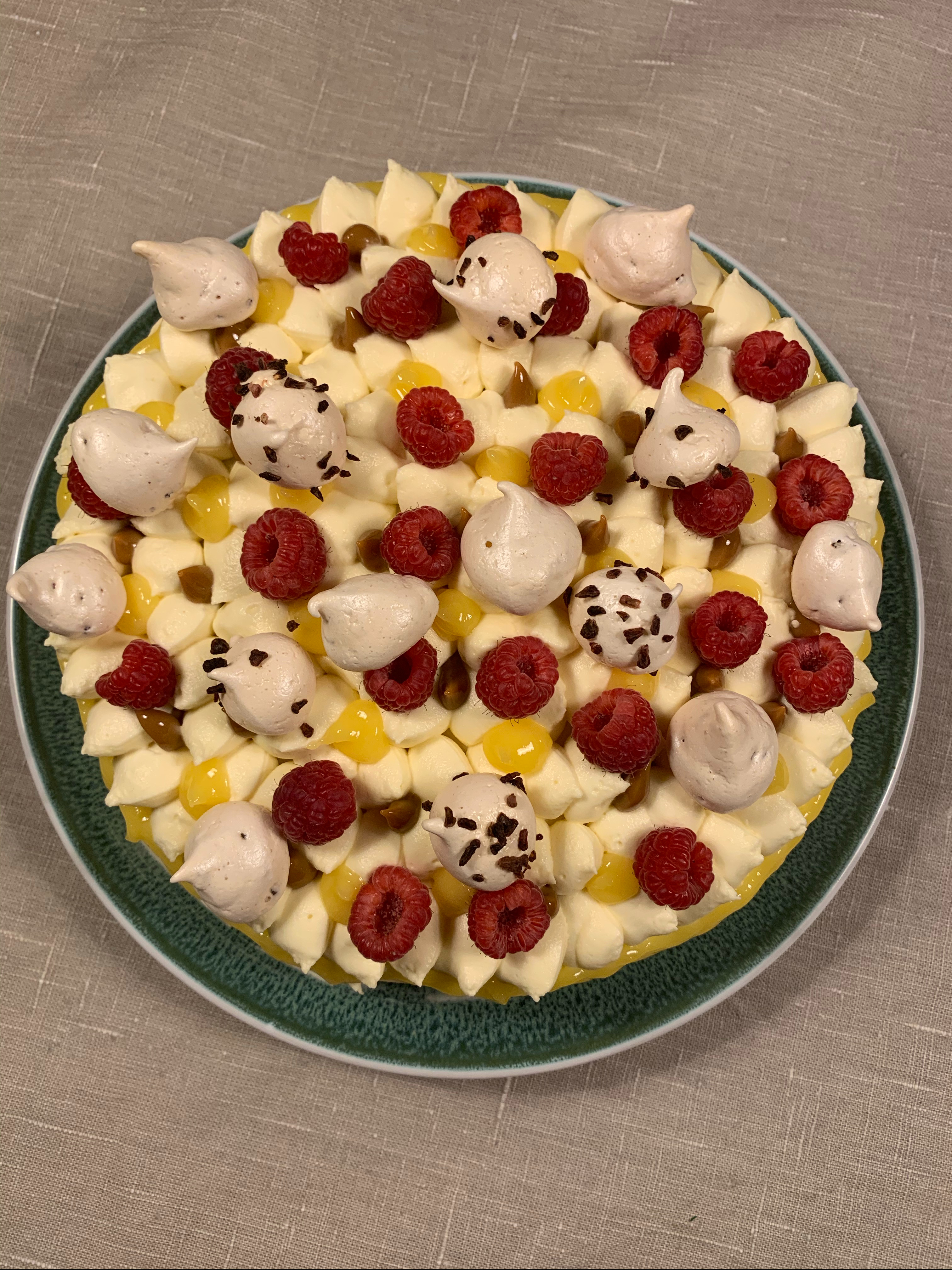 Hallon, lemoncurd, dulche de letche, vit chokladmousse & maräng