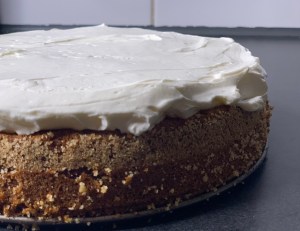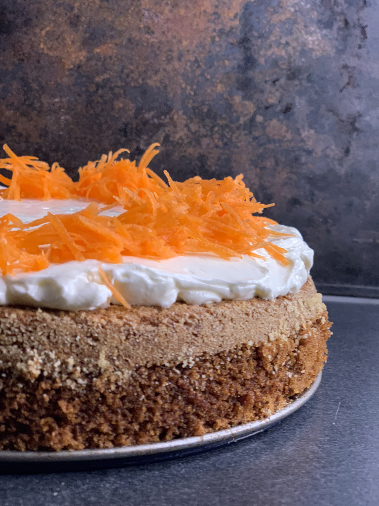 När den hade kallnat vispade jag färskost med florsocker och citronsaft i 2-3min, så att det blev fast och fluffigt. Bredde färskosten över kakan, garnerade med lite finrivna morötter och sen är den färdig att servera. Frostingen är en fräsch variant som jag tycker blir lite lättare, fluffigare, syrligare och fräschare. Men det finns en rad varianter och föredrar du en annan så kör på det.