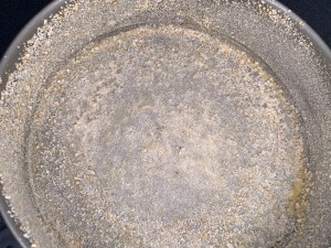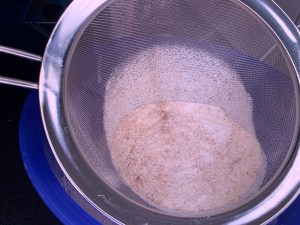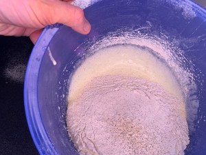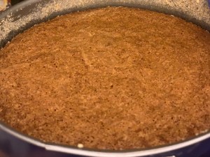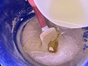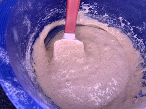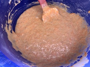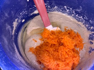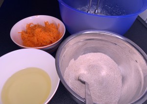 Jag började med att skala och riva morötterna, sen vägde jag upp socker och ägg i en bunke och de andra torra ingredienserna i en annan skål. Vispade socker och ägg pösigt, siktade och vände ner mjölblandningen, adderade olja och rivna morötter, blandade med en slickepott och hällde upp i en smord och brödad form.