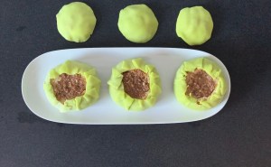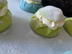 Vad består denna av då. I grunden min kardemummabulle, det första jag skapade i min semelbonanza i år, varsamt urgröpt, fylld med hallonsylt och rostad mandelmassa. På det spritsad grädde och sen har jag klätt både bullen och locket i marsipan. Allt avslutas med pudrat florsocker.