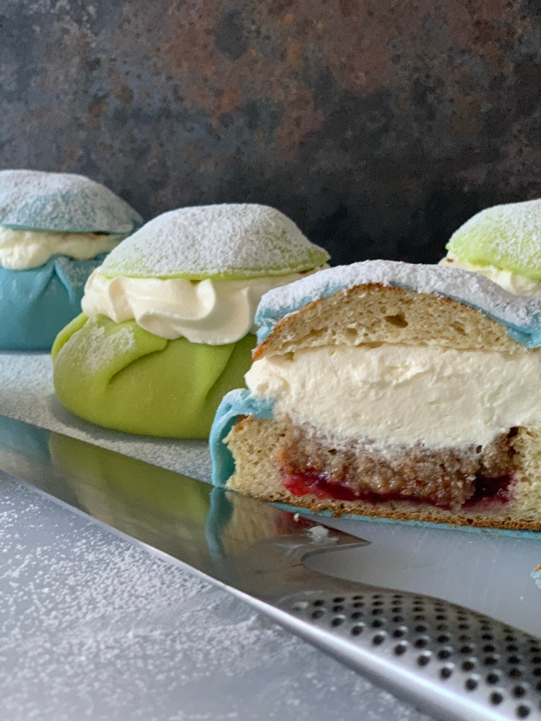 Jag har sparat den här hybriden tills nu, precis innan fettisdagen. Jag har alltid gillat prinsesstårta och dessa små bakverk man ser i flödena ser ju så goda ut. Queens of semlor på Instagram berättade att balansen i denna är svår, att den lätt blir för söt. Jag tycker att jag nådde balans i denna med rostad mandelmassa istället för vanlig mandelmassa. Berätta gärna vad ni tycker om ni testar.