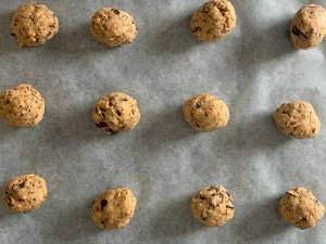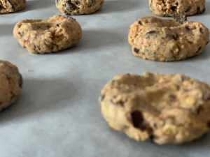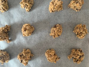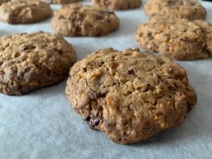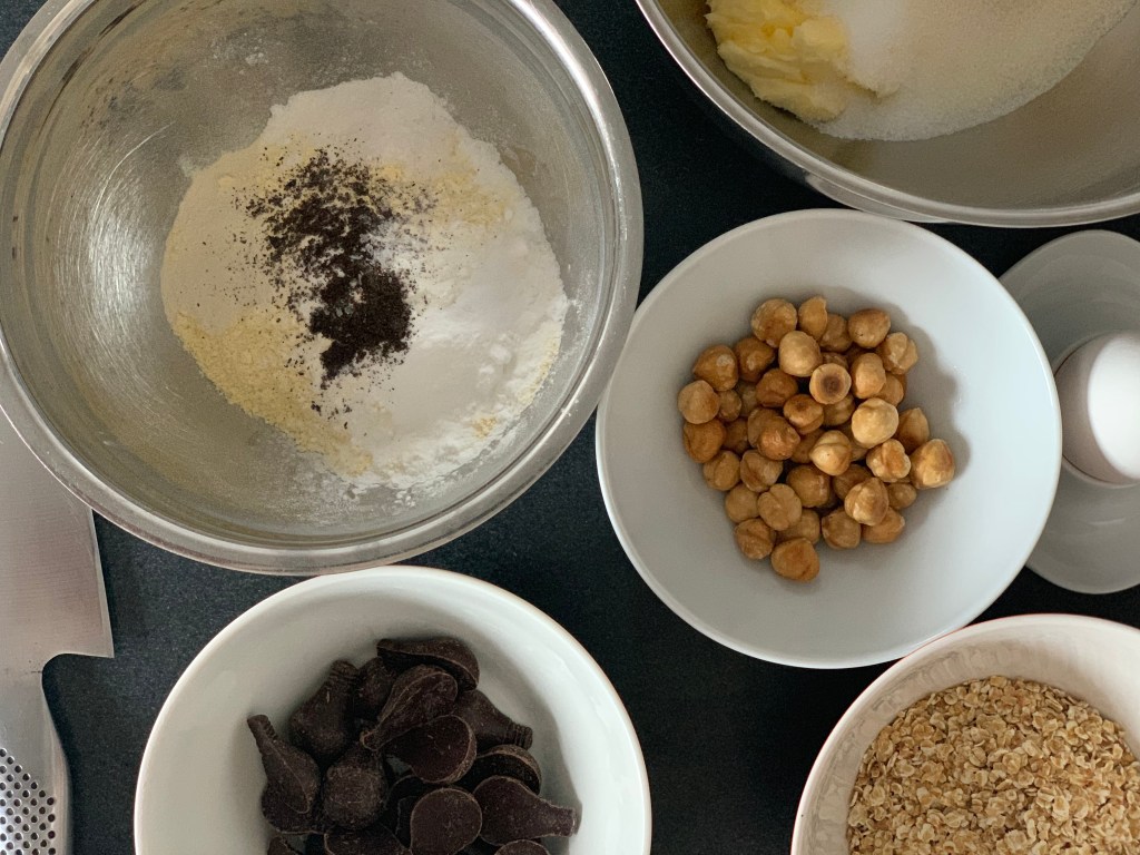 Jag börjar med att rosta hasselnötterna och när de svalnar rostar jag havregrynen, sen krossar jag nötterna med sidan på kniven och hackar dem sedan grovt. Mäter upp och blandar mjöl med bindmedel och vanilj. I en bunke blandar jag socker, flingsalt och smör och sen bygger jag vidare med ägg, mjölblandning, rostade nötter, havregryn och sist chokladen. Jag använder lika delar mörk och ljus choklad, men det är helt valfritt och en smaksak. Väger upp degen i 12 bitar på ca 40g styck och rullar dem sen lätt. Sprider ut på plåten och trycker till med två fingrar innan jag bakar av dem på 180°c i ca 15min. Låter dem sedan svalna på galler.