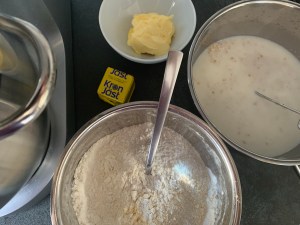 Havregryn kanske ni funderar på, hur de blir hela i en deg. Det blir riktigt bra i bröd om man blötlägger dem i mjölken i ca 30min innan man blandar degen. Då blir de mjuka och löses mer eller mindre upp under processen. Ger struktur och känsla, och smak förstås. Viktigt att inte värma vätskan mer än snabbt till 37°c bara, så man inte kokar gröt på dem.