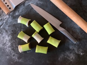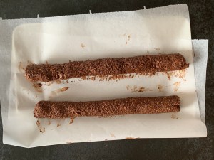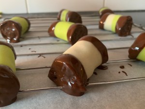 Chokladen. Om ni har möjlighet och kunskap, eller rent av vill testa så tempa den. Ett annat alternativ är att köpa non temp choklad på nätet, eller i välsorterade butiker. Det går också att göra som jag gjorde, vanlig mörk choklad, smält försiktigt i vattenbad, doppa ändarna, kyl och ät. Men håll då i marsipanen och inte chokladen för den kommer att smälta på fingrarna. Otempad choklad blir inte lika glansig och snygg heller, men det smakar precis lika bra.