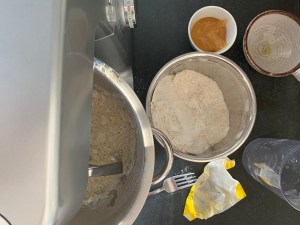 Tillsätt honungen och resten av mjölblandningen, blanda samman och när mjölet inte längre dammar öka farten till strax över hälften och blanda i 4min