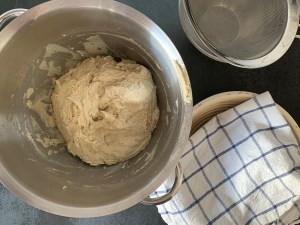 Jäskorgen förbereds med fördel medans degen vilar. Fukta en handduk och lägg i jäskorgen, försök att få så få veck som möjligt på handduken. Pudra den med rismjöl inte för mycket, och inte för lite. För mycket mjöl blir klumpar som man behöver borsta bort sedan och med för lite mjöl så fastnar degen lätt i handduken