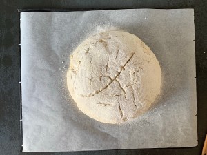 När degen jäst färdigt, vik upp handduken och lägg ett bakplåtspapper på degen, lägg en plåt över pappret och vänd allt uppochner. Lyft av jäskorgen och dra försiktigt av handduken. Pudra med lite rismjöl och snitta brödet
