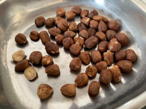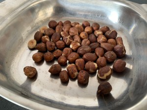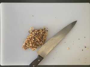 1. För att enklast hacka nötterna, lägg en bred kniv på sidan och krossa dem med bladet. När alla är krossade så går det smidigare att hacka över dem.
