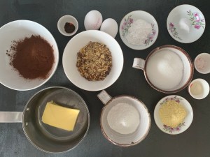Smidigt att baka, rosta av nötterna, krossa och hacka dem, blanda de torra ingredienserna, smält smöret. Vispa samman socker och ägg, sen smör. Vänd ner mjölmixen och sist vänd ner nötterna. Baka av, låt svalna och voilà.