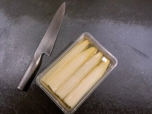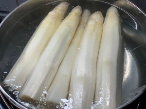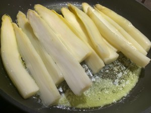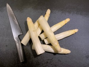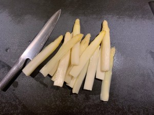 När vi skulle äta och jag förberett ramslöksemulsionen, preppat salladen och hängt sikrommen för att bli av med ev vätska så var det dags för sparrisen att få lite kärlek.