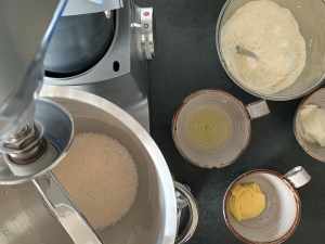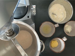 När mjölet är inarbetat, stanna maskinen och tillsätt restan av mjölet och den extra vätskan, blanda samman på låg fart och höj sedan farten till medel på maskinen och kör i 3-4min. Man ska se på degen att de små ”droppformade” klumparna som blir som ojämnheter i början, arbetas in och degen blir jämn