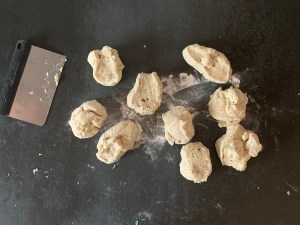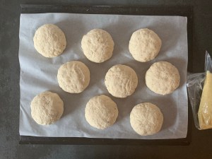 När degen jäst färdigt så väg upp i 9st lika stora bitar, ca 70g och rulla till släta bollar. Lägg med jämnt avstånd på en plåt med bakplåtspapper