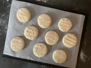 Platta till bollarna till pucka ca 2-3cm höga och täck med plastfolie