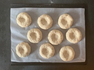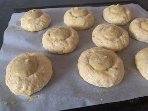 Efter ca 30min gör ett djupt och brett hål i varje bulle med lätt mjölat finger