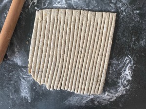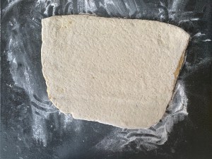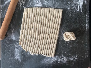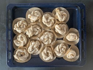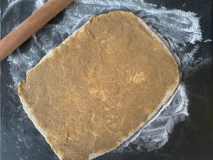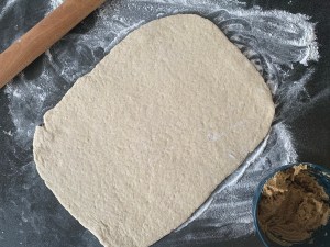 Jag gav mig på snurror och då kavlade jag ut degen, fyllde den jämnt, vek den på mitten och kavlade den sen igen. Andra kavringen är för att den skulle bli tunnare och utan luftfickor. Var försiktig när du kavlar andra gången, se till så att du har mjölat under och att du inte kvalar igenom smöret. Kavlar du för tunt så ä risken stor att de spricker när de jäser, eller i ugnen.