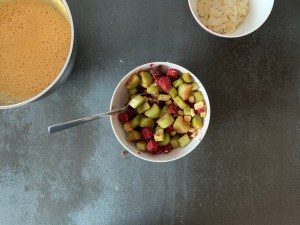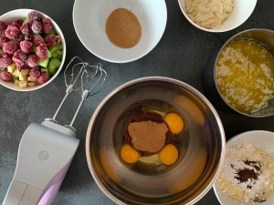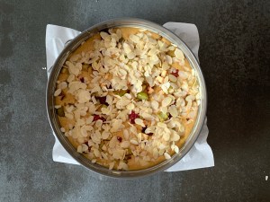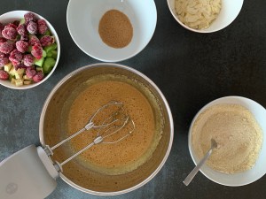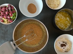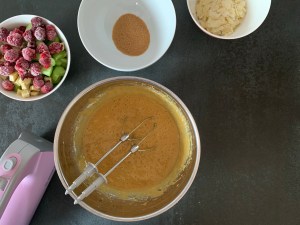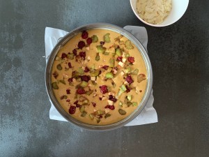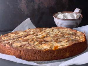En kaka med en botten baserad på mandelmjöl, ägg och farinsocker. I bottensmet la jag sen en blandning av färsk rabarber, frusna hallon, hackad vit choklad och mortlad kardemumma. Efter det toppade jag den med flagad mandel och bakade av den.