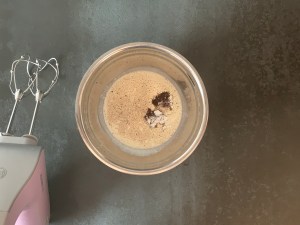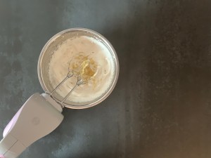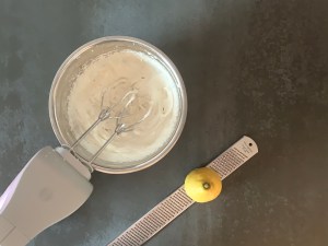 Ingen kaka utan något gott till så jag vispade grädde med florsocker, vaniljpulver och pyttelite bakpulver, när den var fast och fin så zestade jag 1st citron och vispade ut skalet i grädden. Den lätta syran tillsammans med den söta vaniljgrädden var en bra finish till kakan.
