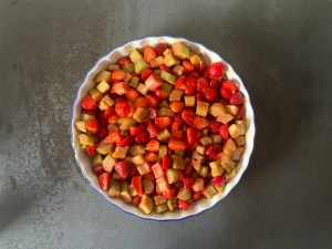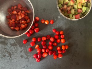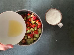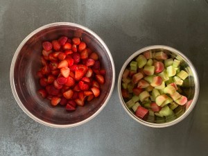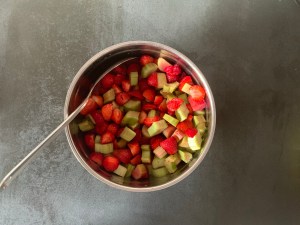 Färsk rabarber, solmogna jordgubbar, lite citronsaft, socker och majsstärkelse fick bli fyllningen.