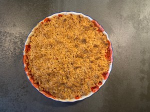 Smorde en pajform och fördelade fyllningen jämnt i botten, sen smulade jag över min crumble och gräddade pajen i 200grader.