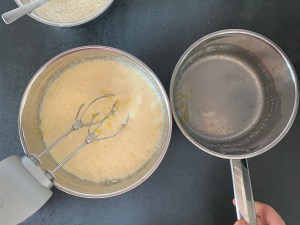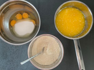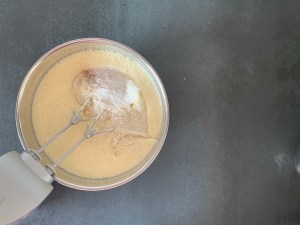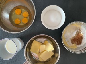 Efter det så blandar man mjölmixen och kryddar den med kanel och kardemumma. Sen smälter man smöret. Vispar efter det ägg och socker vitt och pösigt, tillsätter smör och mjölk och vispar slätt på låg hastighet. Sen tillsätter man mjölmixen och vispar till en smet.