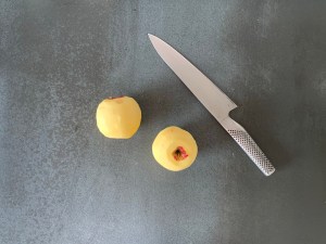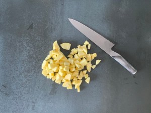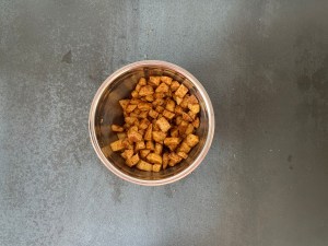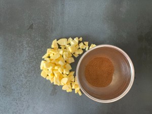 När granolan är klar så kan man börjar med själva baket. Börjar då med att skala och tärna två äpplen, blanda bitarna med farinsocker, kanel och vaniljpulver.
