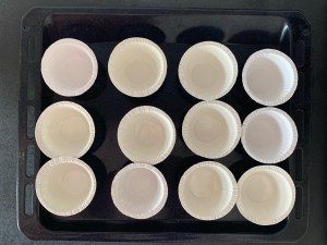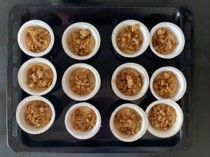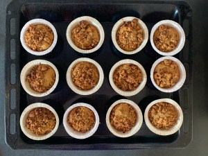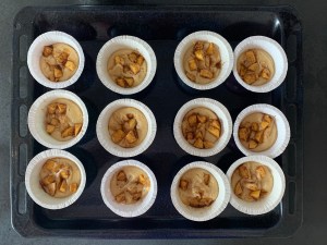 Fördelar smeten i formarna, lägger i några bitar äpple och trycker ner med en sked. Sen toppar man med lite granola i varje form och bakar av dem i ca 20min.
