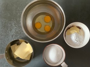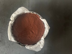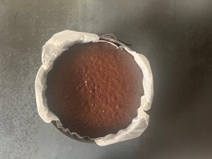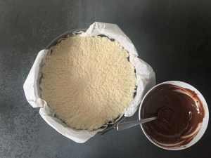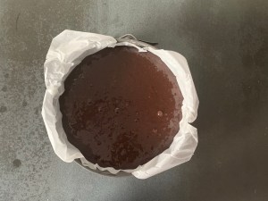 Först bakade jag kladdkakan och kylde den i sin form. Använde ett bakplåtspapper i formen för att få mer kontroll på fyllning och för att lättare få ut den ur formen.
