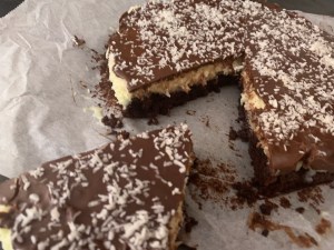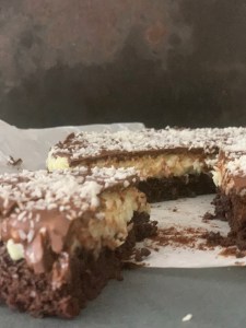En krämig kladdkaka, jag använde mitt recept, samma som jag har i Kärleksmumskladdkakan, men jag ökade tiden i ugnen med 3min. För att den skulle bli lite fastare och inte kollapsa av kokostoppingen. Sen ett krämigt, sött lager av kokosfyllning, toppad med ett lager choklad.