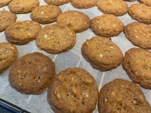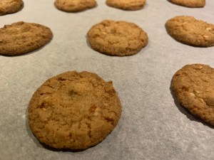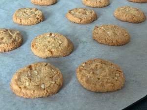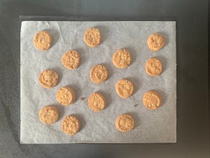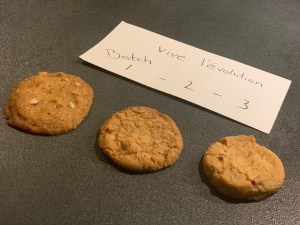 Satte igång batch tre, samma metod som tidigare men lite andra proportioner. När degen var kyld, skuren och låg på plåtar så åkte den in i ugnen och jag höll tummarna. Efter några minuter tände jag lampan i ugnen och kikade in. De såg så mycket bättre ut, som en torr kaka ska se ut och inte platt, utsjunken och flarnig. Jag kunde knappt bärga mig när de väl kom ur ugnen, men de måste kallna först, innan de har kallnat är de alldeles för mjuka.