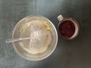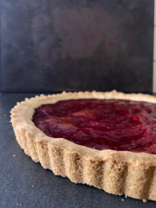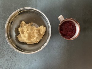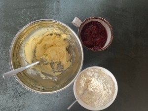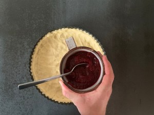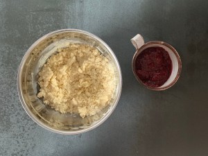 Själva degen är enkel att blanda. Smör och socker blandas som med en gaffel. Sen blandar man ner de torra ingredienserna och blandar allt med en gaffel till en gryning massa. Avslutar med att knåda samman degen för hand. Pressar ut den i formen, bred ut sylten i ett jämnt lager och bakar av den. Jag låter den svalna i formen innan jag lyfter ur den.