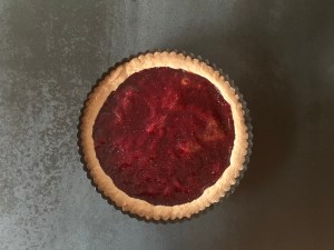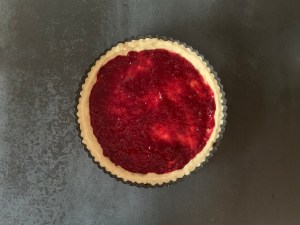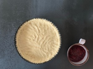 Jag ökade mitt recept på hallongrottor med ca. 1/3 till och klädde sedan en form med löstagbar kant, ca 26cm i diameter med degen. För att få bra proportioner lämnade jag ungefär halva höjden på formens kant utan deg. Bredde på sylt och bakade den i ca 25min.