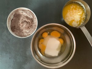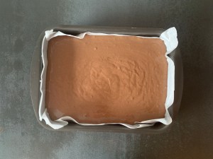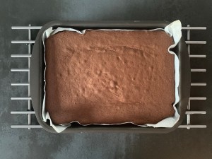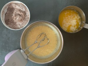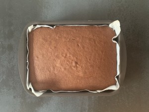 Först bakar jag kakan. Smälter smöret, blandar mjölmixen, vispar ägg och socker, tillsätter mjölmixen, blandar slätt och tillsätter smör och mjölk. Bakar sedan av kakan.