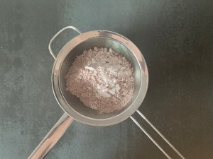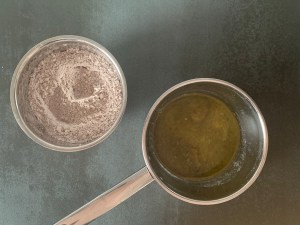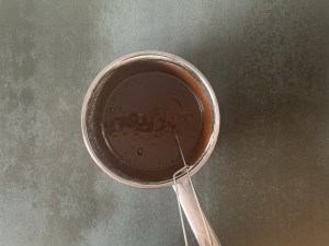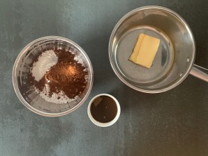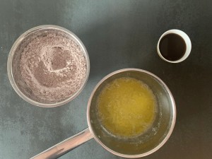 När den står i ugnen gör jag glasyren. Klassisk glasyr med smör, florsocker, smak och vätska.