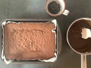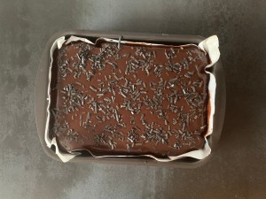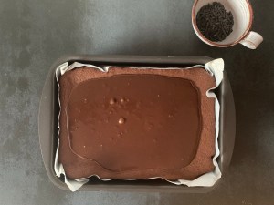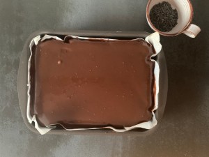 När kakan svalnat en liten stund breder jag ut glasyren i ett jämnt lager och stör över saltlakritsflakesen.