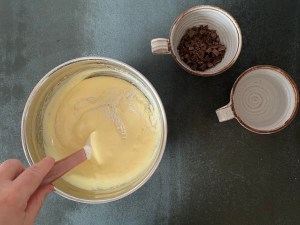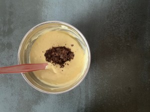 Grundsmeten till min Silviakaka med lite vaniljpulver och hackad choklad fick bli botten. Smeten är lite tunn så chokladen sjunker till botten vilket blir en bra mix tillsammans med glasyren på toppen.