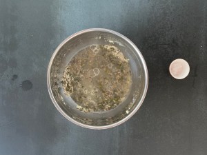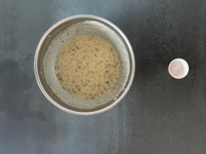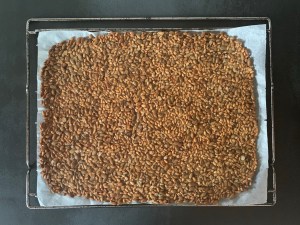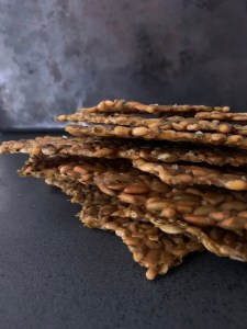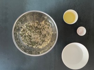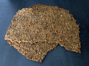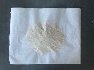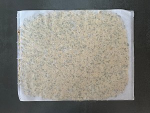 Sen tillsätter jag rapsolja och kokande vatten, vispar samman till en jämn massa och låter den vila i minst 10 minuter. Det går bra att vila den upp till en timma. Sen kavlar jag ut den mellan 2 bakplåtspapper, strör flingsaltet ovanpå och bakar i förvärmd ugn. Viktigt att man använder över och undervärme, INTE varmluft.