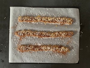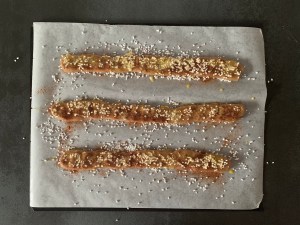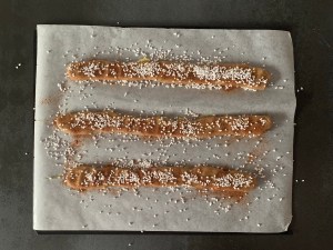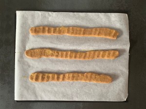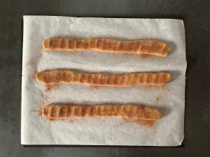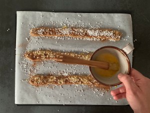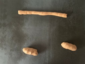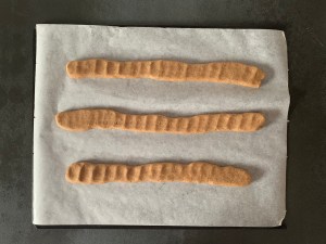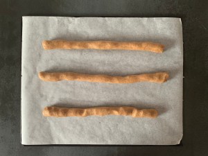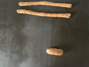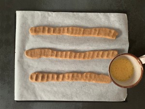 Bitarna rullar jag ut till långa korvar, ca 30 centimeter, pressar ner dem med två fingrar. Penslar med ägg, pudrar över kanel, strör över pärlsocker, penslar en gång till, försiktigt, lite mer pärlsocker och sen skjuts in i ugnen.