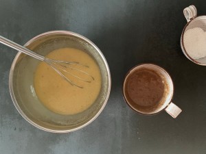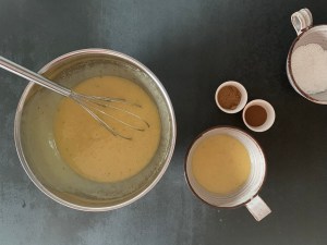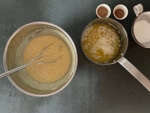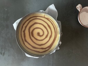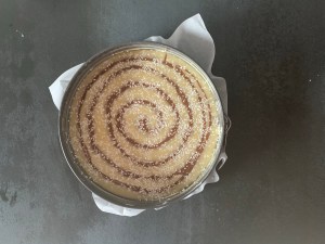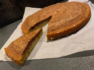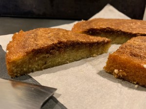 Grunden är min kardemummakladdkaka, som jag tog fram till min ”Kladdla” (semmelkladdkaka) tidigare i år. Sen använde jag mig av Camillas variant där man tar lite smet och smakar upp med kanel och farinsocker, sen ringlar man det så att man får ett kanelbullemönster i kakan. Jag toppade den med pärlsocker och sen bakade jag av den. Så gott och så enkelt.
