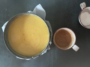 Servera med vispad grädde, pudra lite kanel över kakan och avsluta med lite pärlsocker