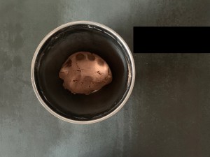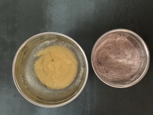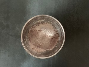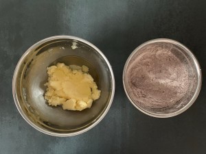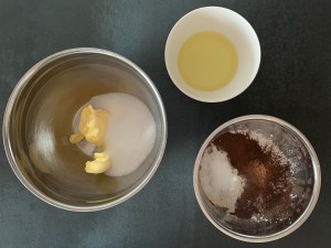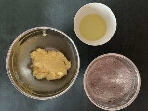 Först väger jag upp smör och socker i en bunke, sen olja i en skål och restan av de torra ingredienserna i en annan skål. Blandar smöret med sockret, med en sked. Sen tillsätter jag oljan och blandar till en jämn smet. Efter det blandar jag i de torra ingredienserna och blandar till en jämn massa. Avslutar med att blanda lite för hand och känna på degen.