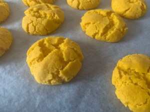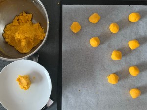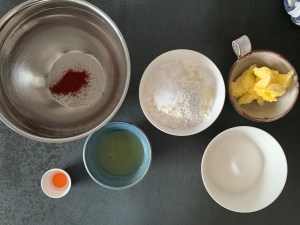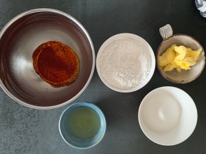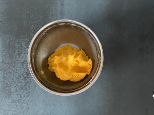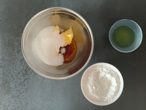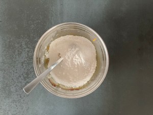 Jag väger upp allt först. Sen lägger jag saffran i blöt i vattnet, i fem minuter. Det gör jag i bunken jag ska blanda allt i, så att man inte förlorar något av saffranet om man byter från skål till bunk. Sen tillsätter jag smör och socker och blandar det till en jämn massa med en gaffel, efter det tillsätter jag olja och blandar jämnt med gaffeln. I med mjölmixen som jag blandat och arbetar med gaffeln, när det är jämnt blandat så knådar jag den för hand och sen väger jag upp i bitar, rullar till bollar och bakar av i ugnen.