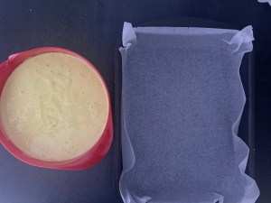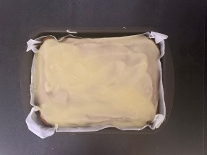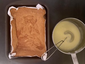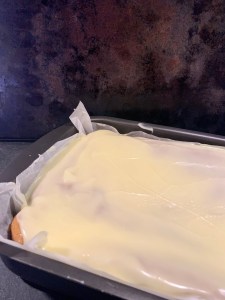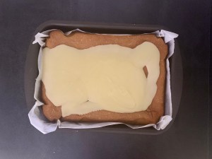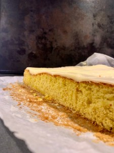 Glasyren är samma som till strösselrutorna, men utan att toppa kakan med strössel. Funderade fram och tillbaka på om jag skulle ge mig på en apelsinglasyr, men landade till slut i att en neutral glasyr skulle passa kakan allra bäst.