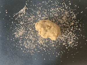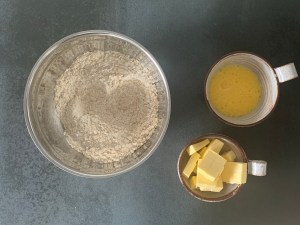 Först blandar jag alla torra ingredienser, sen arbetar jag in smöret för hand. Vispar ägget och knådar sen in det i degen.